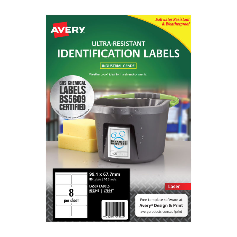 Avery Laser Label Outdoor L7914 99.1x67.7 8Up Pk10 look neat and stylish - perfect for marking your components or small appliances. Whether you need to add your company name or a security code, you can create your labels using free Avery software.